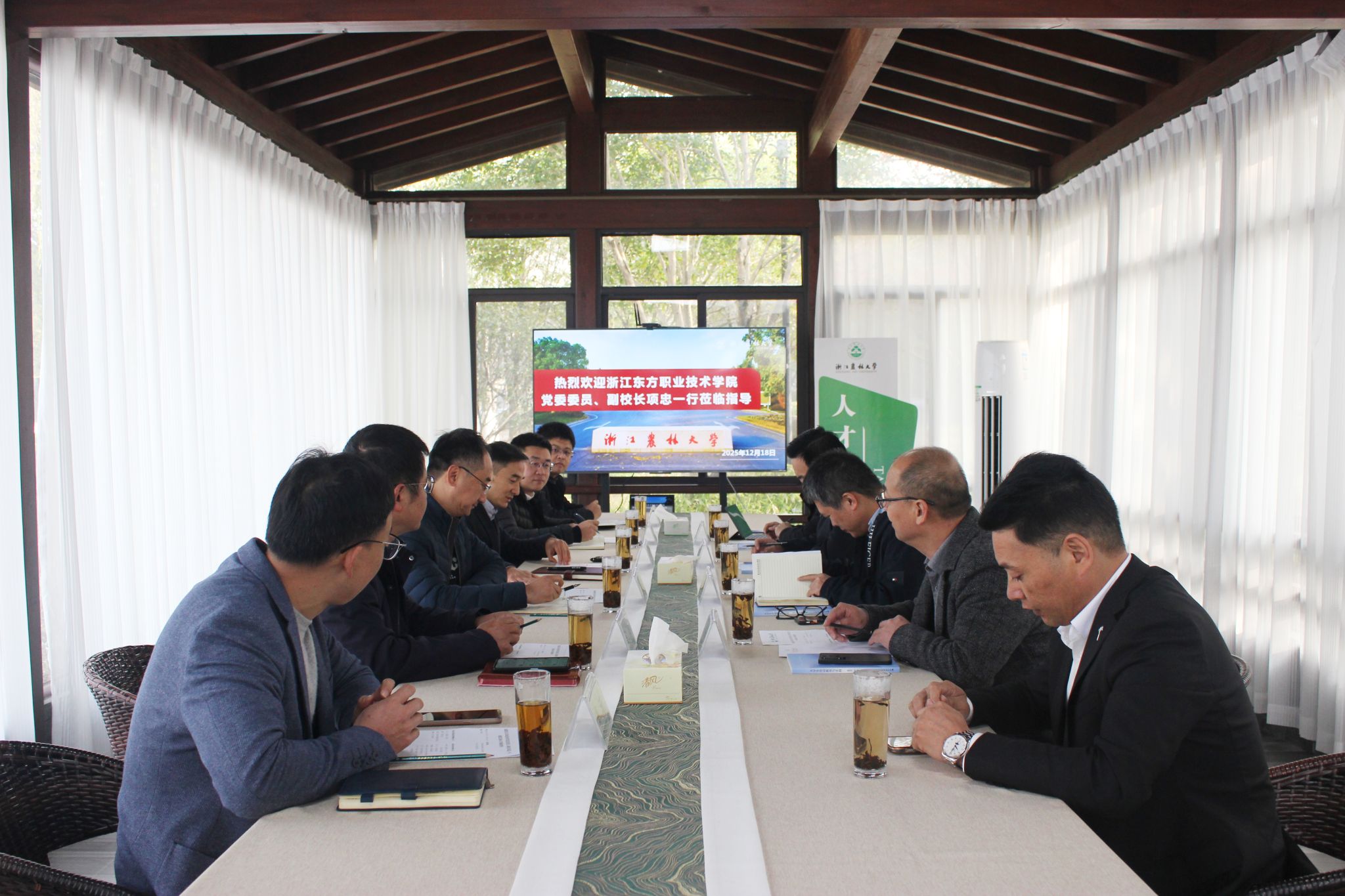 12月18日,浙江东方职业技术学院党委委员、副校长项忠一行来校考察交流。公管处、保卫部、信息中心、后勤中心(吴越公司)相关人员陪同交流。