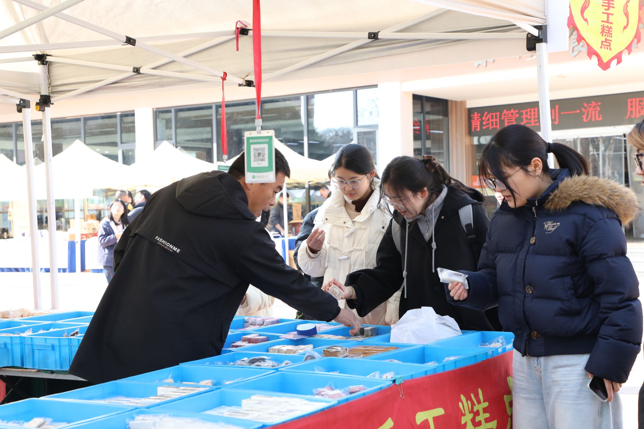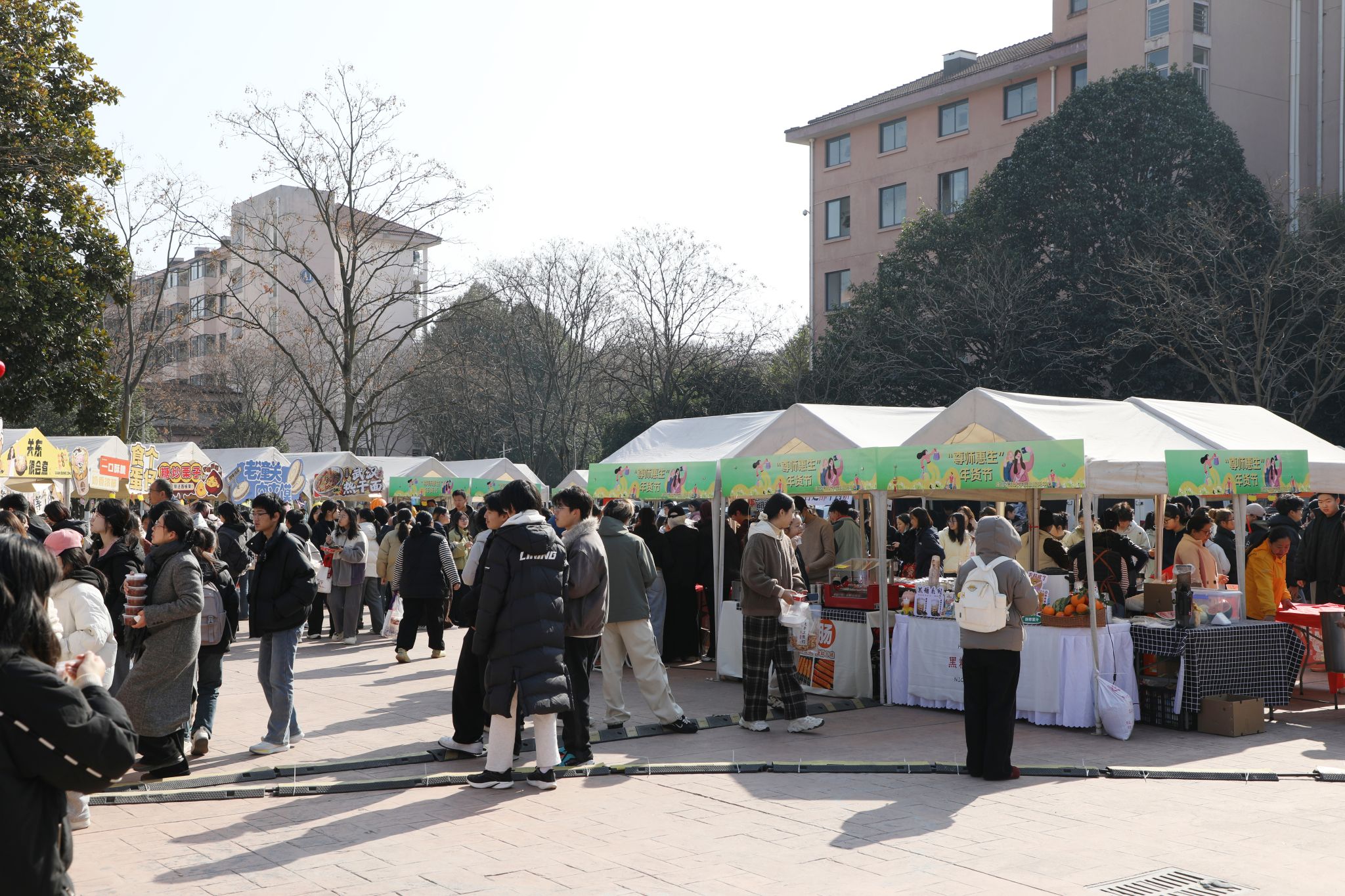 年货节现场,40余个精选摊位在此集结。除了食堂大厨的招牌卤味和各色美食小吃外,最引人注目的莫过于品类多样的消费帮扶产品。据悉,本次年货节是后勤中心深化“校地帮扶”、助力乡村振兴的重要举措。中心积极拓展帮扶思路,不仅帮农民“卖得出去”,更注重“卖得好、卖得远”,通过引入美味小吃等受市场欢迎的产品,提升了年货节的吸引力,也让师生们在享受购物乐趣、置备满意年货的同时,切实为乡村产业发展贡献一份力量。