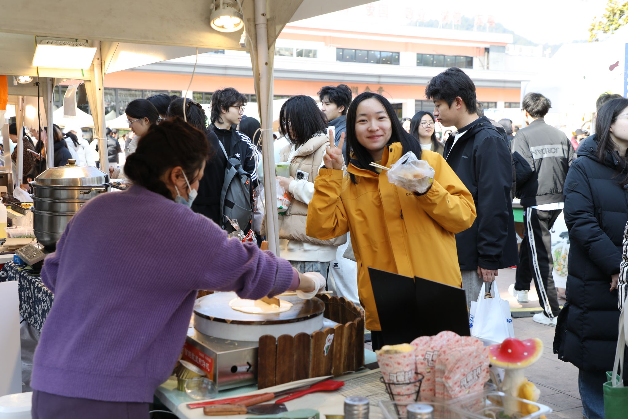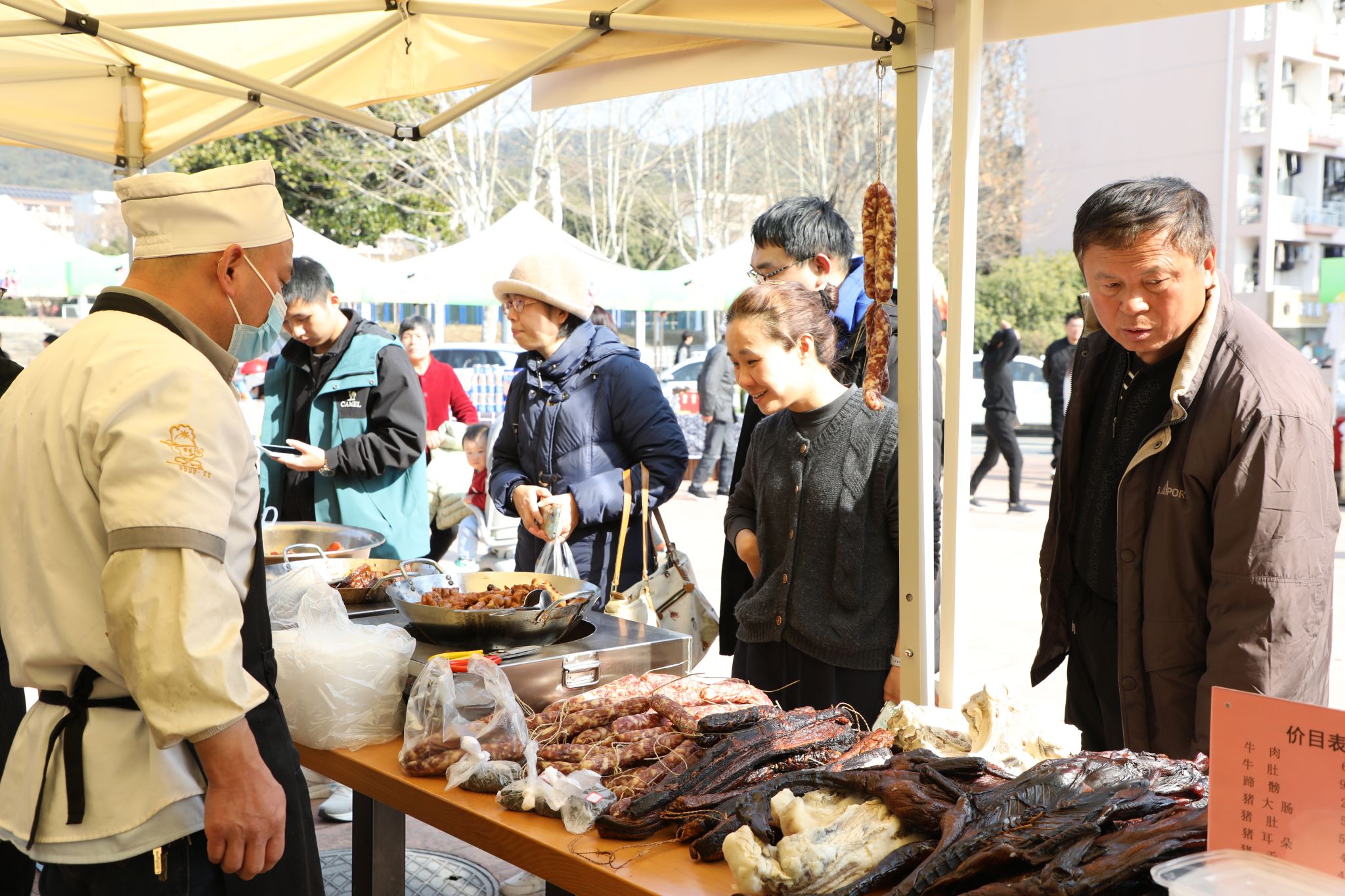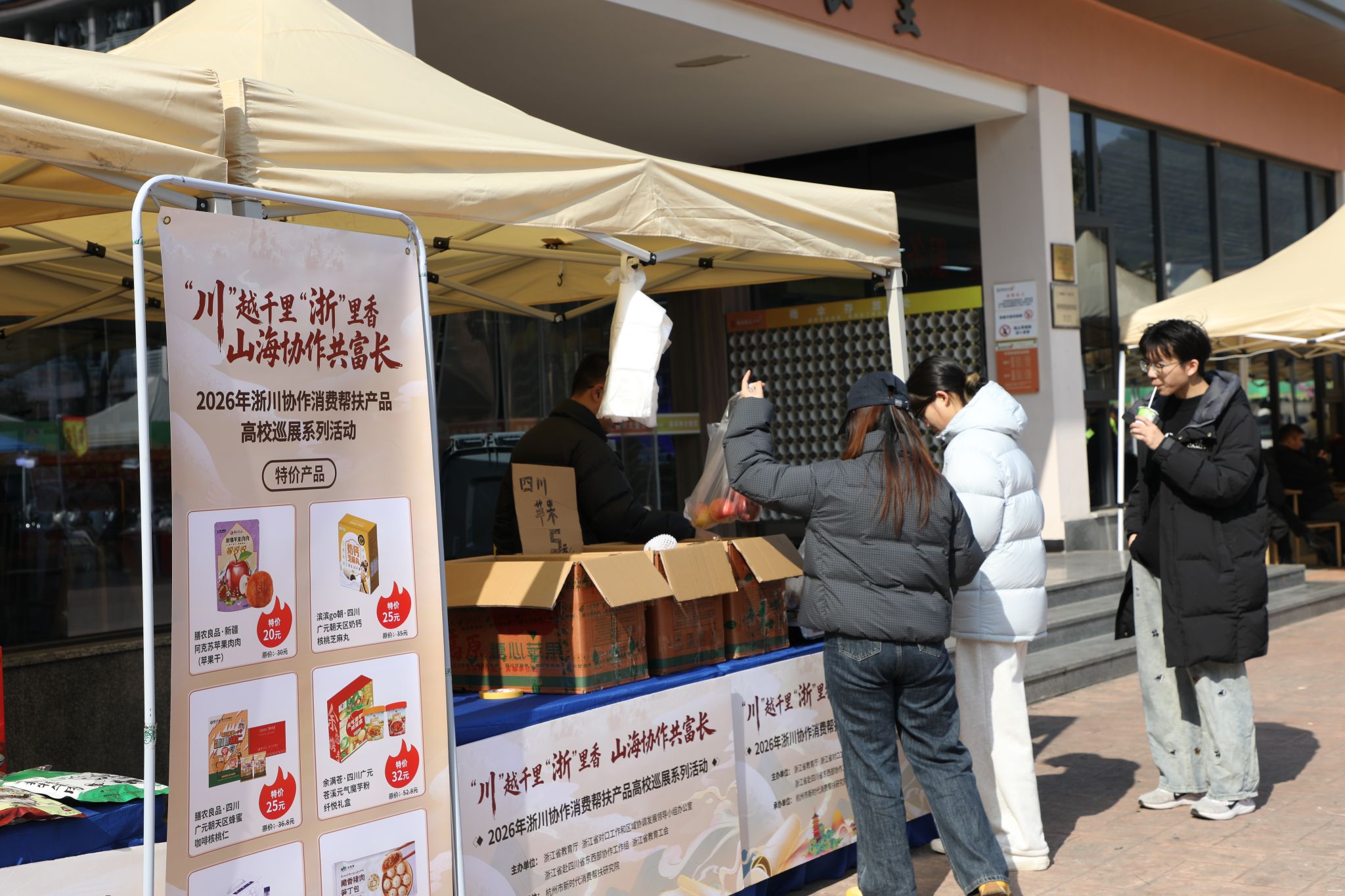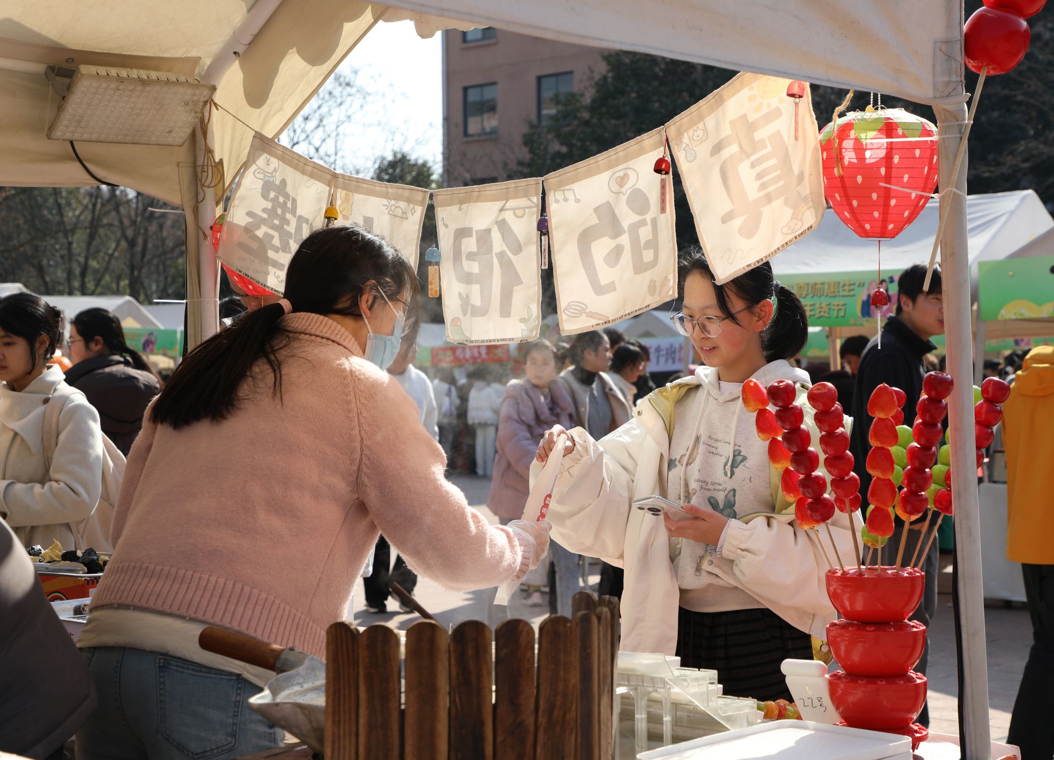 “在学校门口就能买到这么正宗、干净的海味,过年包饺子、炖汤有着落了”!农产品摊位上,虾皮、干贝、鱿鱼干等海味干货包装精致;核桃、杏仁、腰果、开心果等优质坚果价格实惠;酒酿馒头等传统美食口感独特,引得现场师生食指大动,纷纷参与到消费助农的行动中来。