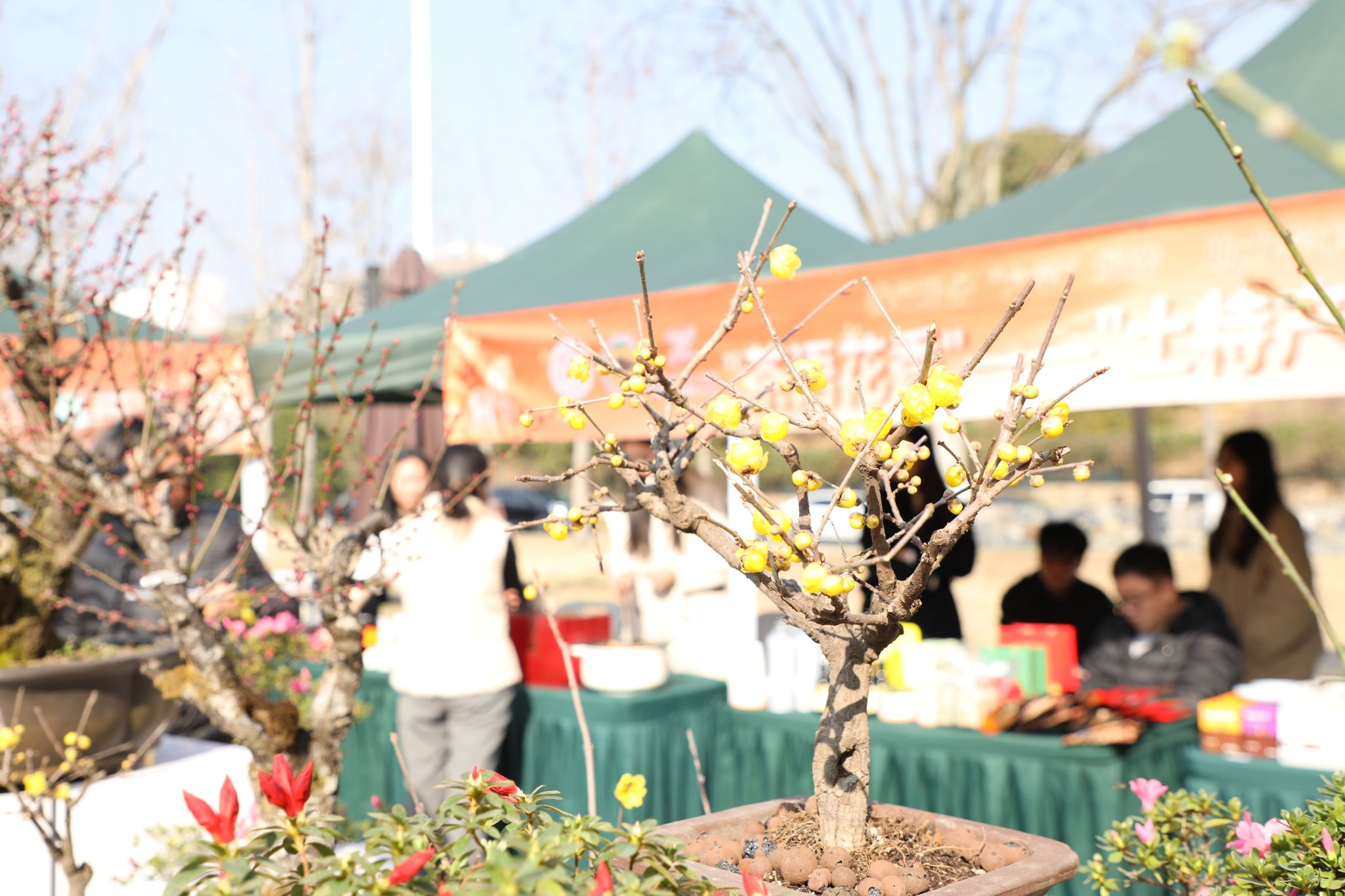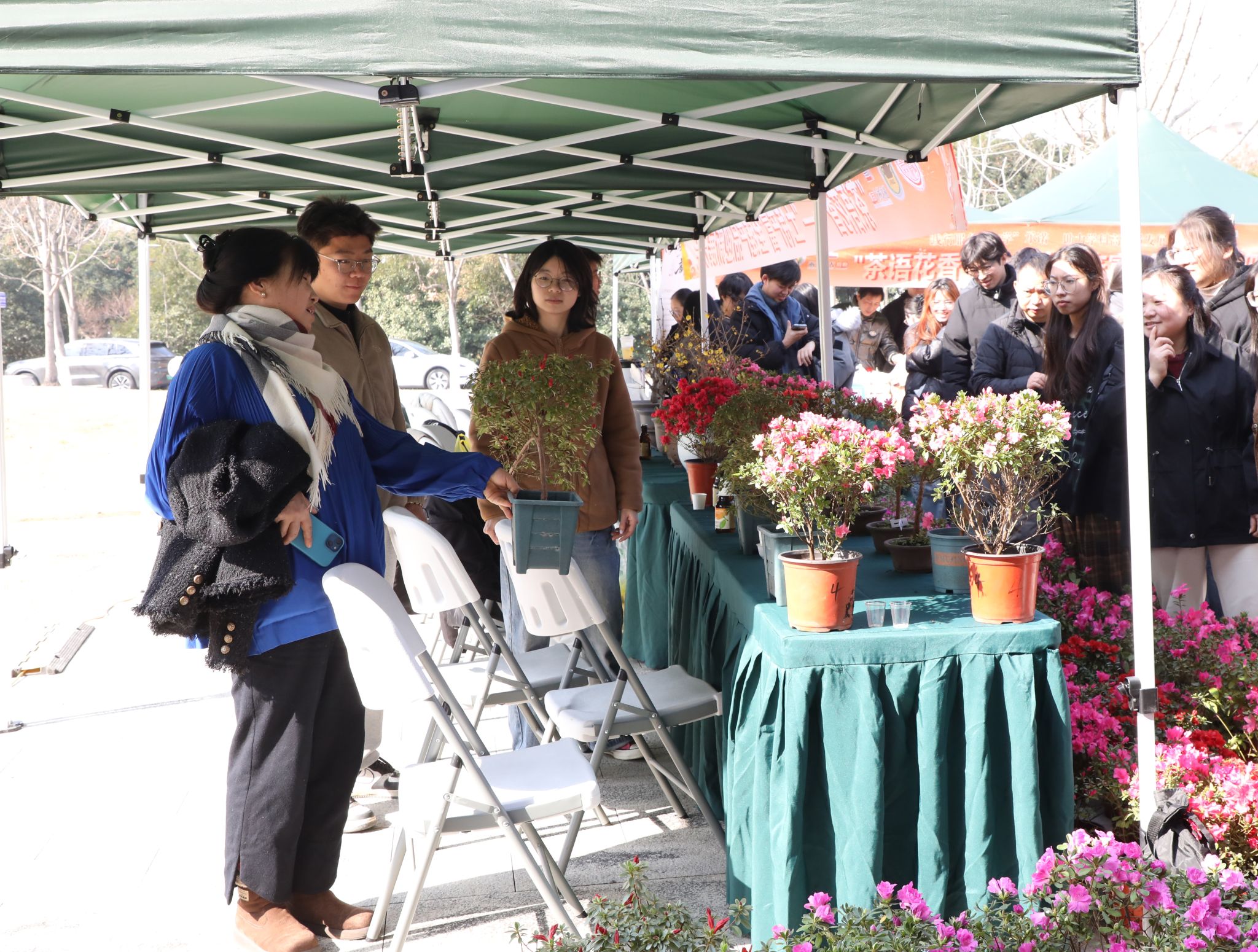 活动中,一番“茶语花香”的景象引得师生纷纷驻足。已养护20年的老桩梅花盆景、省级良种“金铃”蜡梅,蓝樱、琉球红、大朱砂、小桃红等十余个杜鹃盆景古朴典雅;香茶精酿啤酒、果茶气泡饮料、茶饼干、茶香腊味等茶产品创意十足……一件件科研产品凝结着师生的智慧结晶,展示了我校深化产教融合、推动科研成果落地转化的生动实践。科研团队师生化身“讲解员”,向参观者详细介绍成果的技术原理与应用前景,现场充满了崇尚创新、探索未知的学术氛围。师生们一边品尝后勤摊位的美食,一边选购心仪花卉、茶叶,为新的一年添色增香。