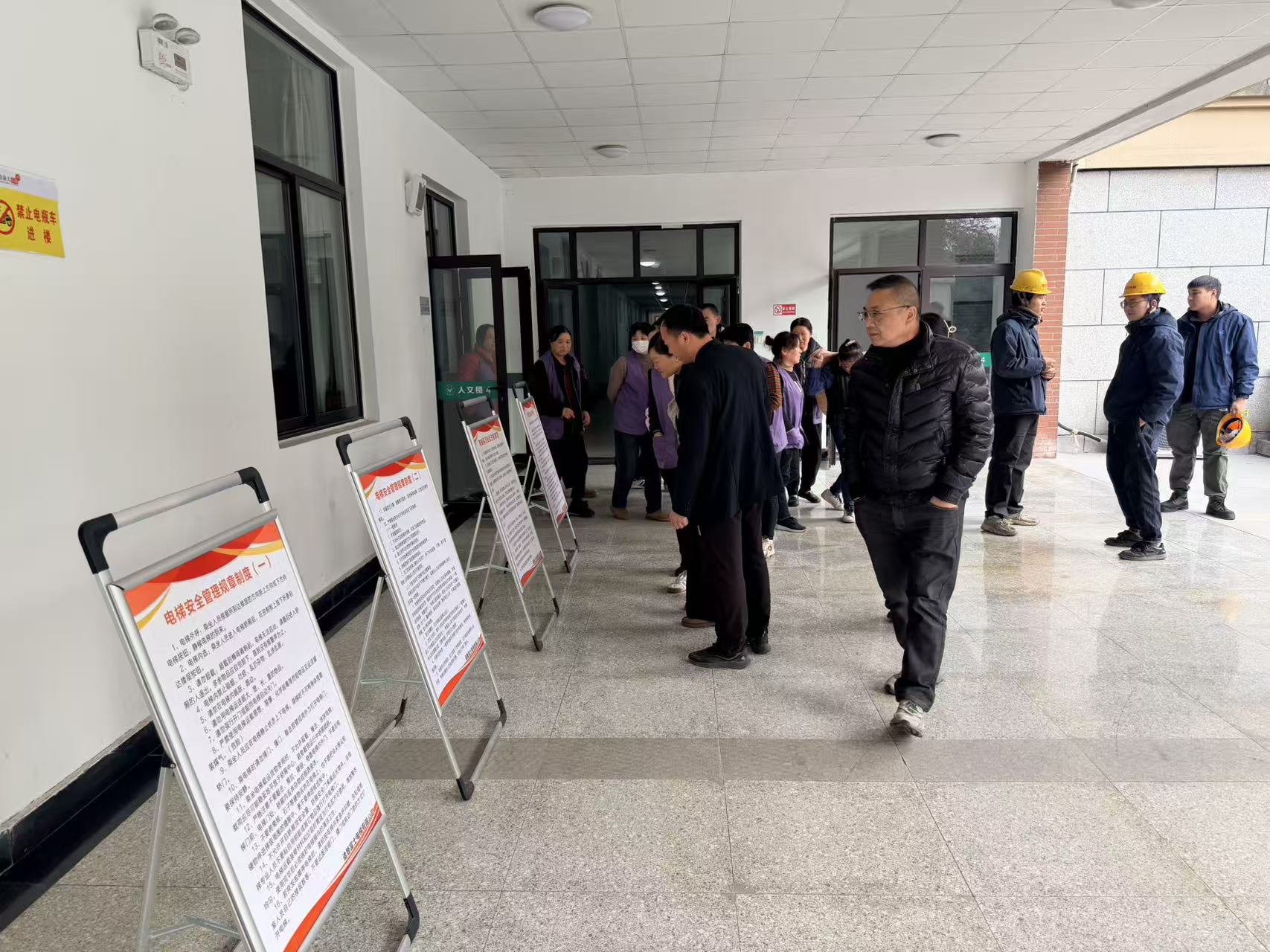 演练开始前,维保单位技术人员结合校园电梯使用频繁、人流密集的特点,为参训人员系统讲解了安全乘梯规范、常见故障识别及突发状况下的正确应对方法。现场还设置了安全知识展板,积极倡导“文明乘梯、安全同行”的理念,营造了浓厚的安全氛围。