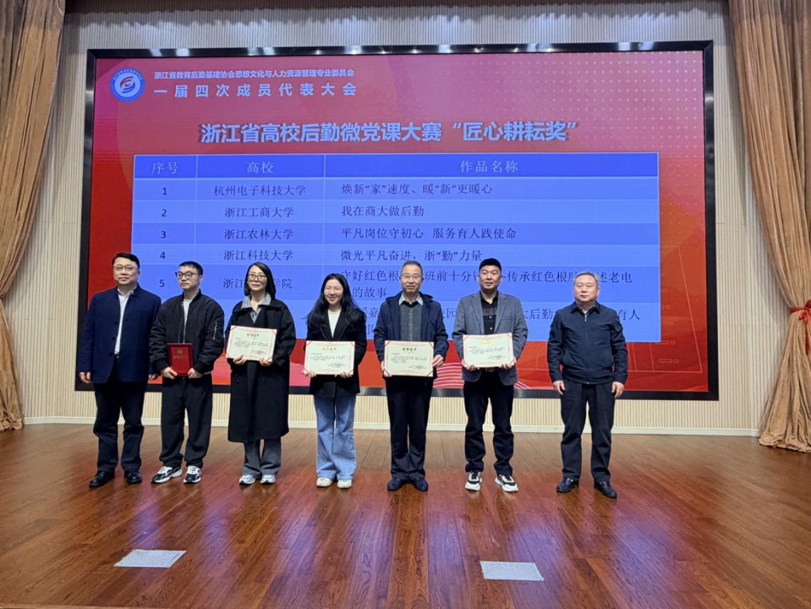 大会表彰了浙江省高校后勤微党课大赛获奖作品,由公寓、物业、修建服务部党支部联合选送的《平凡岗位守初心服务育人践使命》,以及餐饮服务部党支部选送的《平凡岗位见初心一餐一饭总关情》获“匠心耕耘奖”,诸暨服务部党支部选送的《牢记育人使命,展现后勤担当——探索新时代“枫桥经验”后勤实践》获“卓越风采奖”。