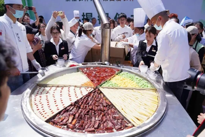 占据现场C位的这口“吴越六鼎太平锅”,以吴越王钱镠“六事安民”治世功绩为文化底蕴打造,锅中六道笋菜均由学校食堂厨师团队现场烹制,免费供师生品尝。这一锅佳肴用到冬笋、春笋、雷笋、毛笋四类笋以及各类配料总计超过1000斤,用料十足。